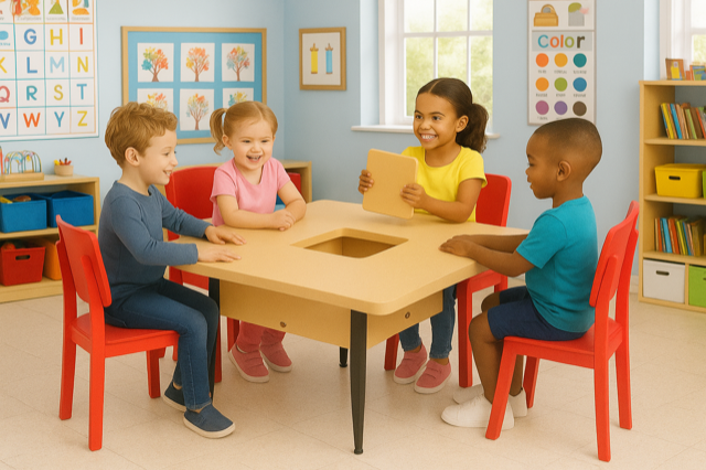 Table Top-On transforms learning spaces with its innovative floor-to-chair transition design. The integrated storage keeps supplies organized while improving hygiene by keeping children off the floor, creating better classroom flow and engagement.